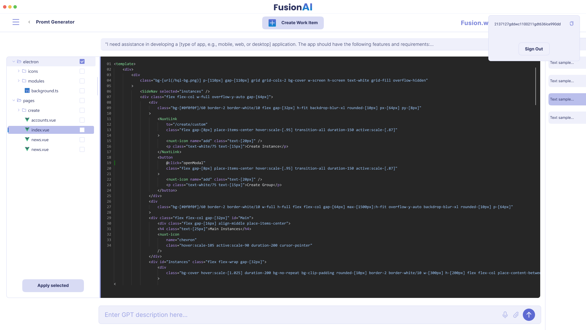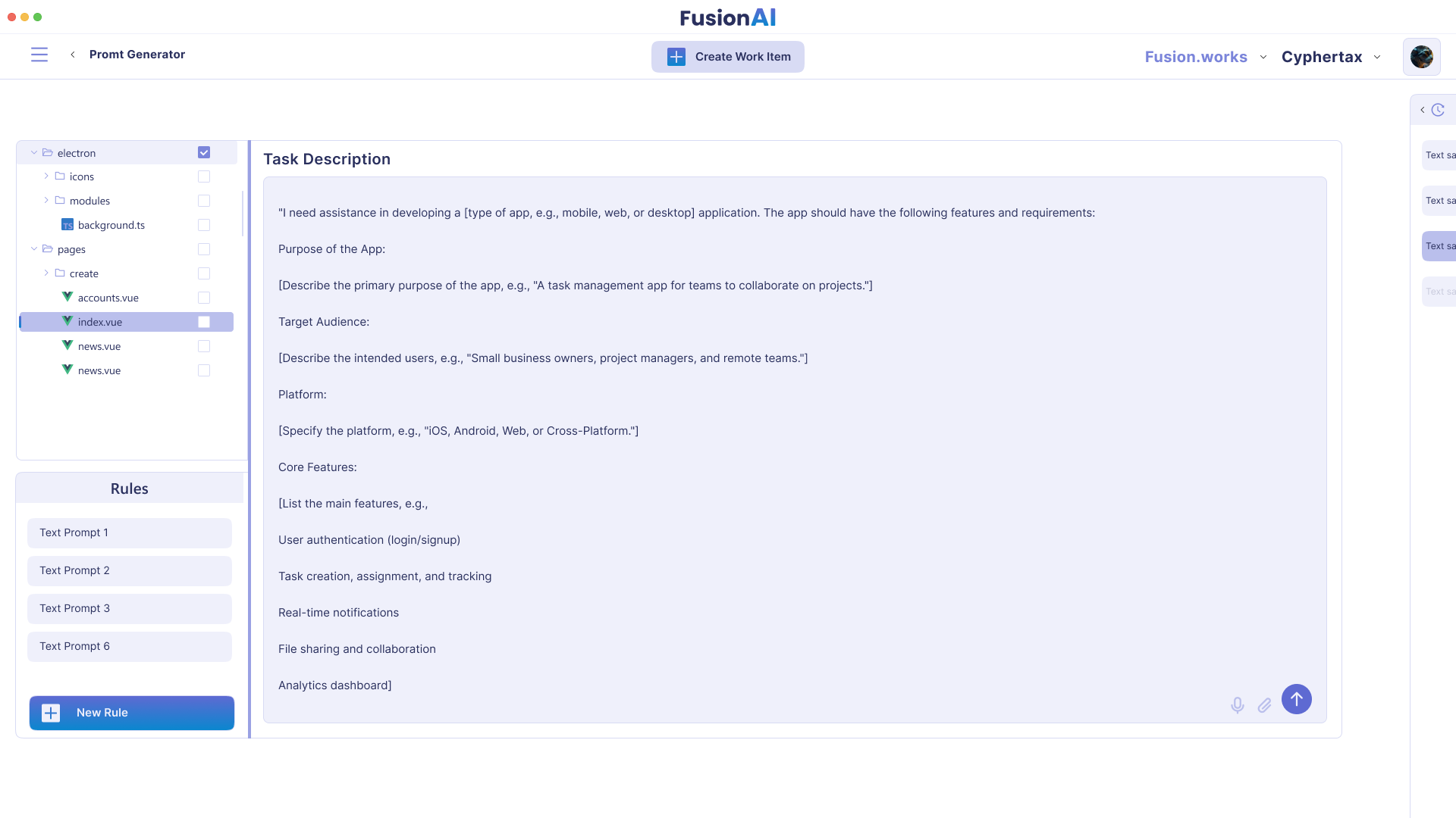 Create a work item that compiles your request, task details, relevant knowledge base excerpts, and current code snippets.