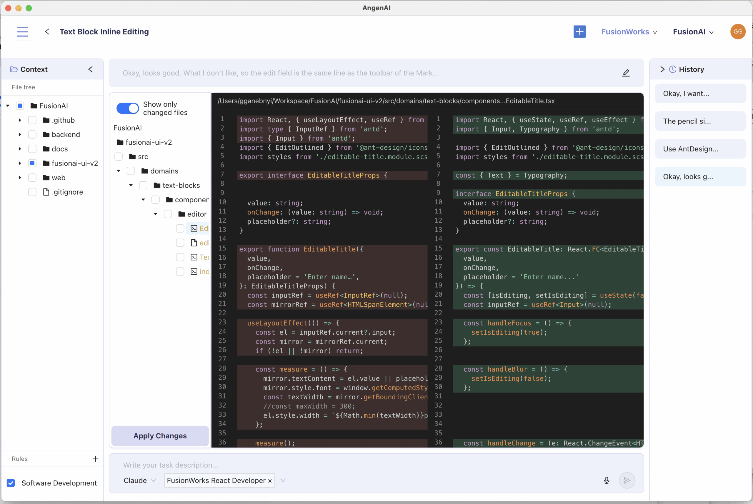 By understanding your specific coding standards and project context, angen.ai produces code that meets technical requirements and conforms to company-wide practices.
