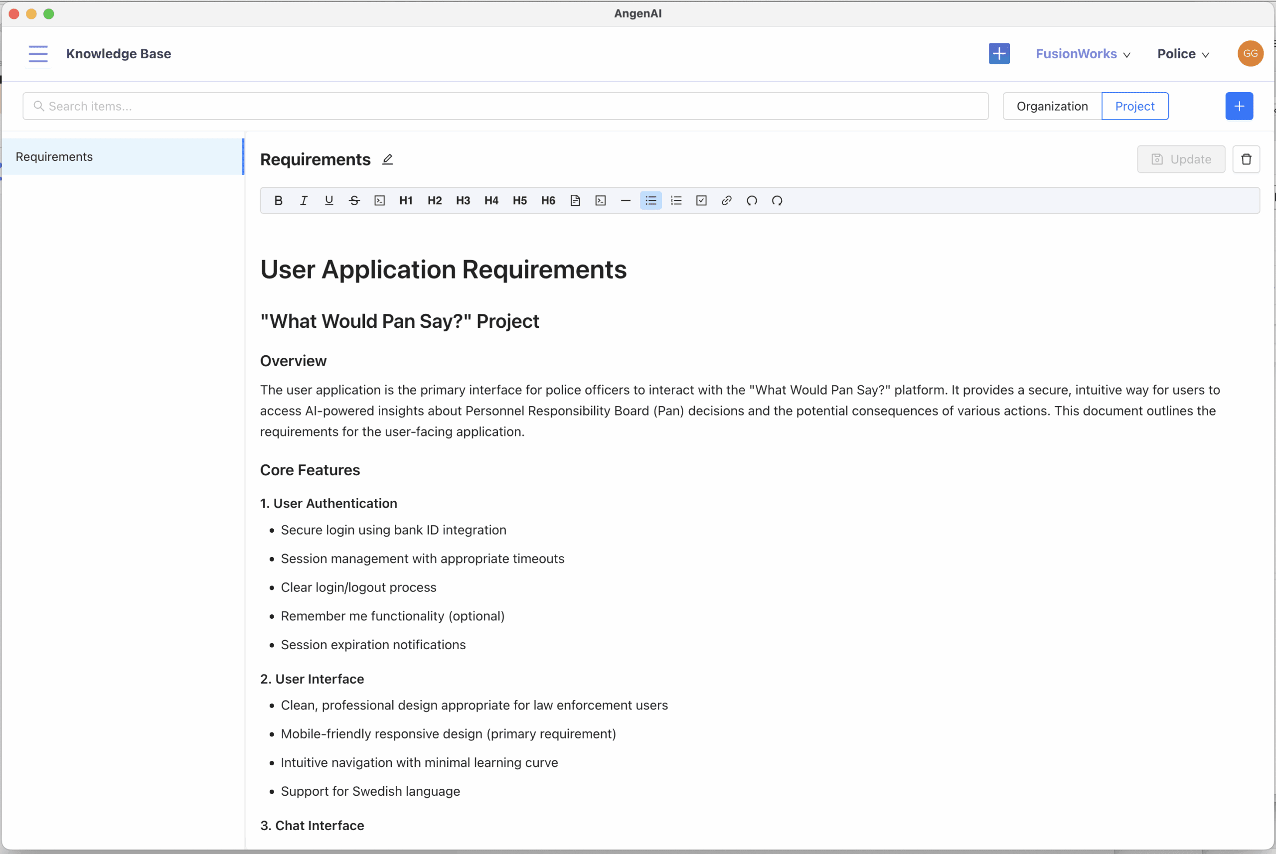 Download the desktop application, create your organization and project, and connect your knowledge bases and code repositories.
